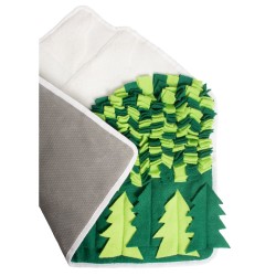 Tappeto realizzato con inserti, tasche portasnack, materiali dalle diverse consistenze e suoni fruscianti, per un divertimento interattivo.