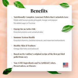 L’unico pellet di frutta realizzato esclusivamente con la dolcezza naturale della frutta, senza zuccheri o fruttosio aggiunti. I pellet gourmet alla frutta tropicale per parrocchetti portano le papille gustative del tuo uccello ai tropici! Veri pezzetti di papaya, mango e ananas conferiscono nuove sensazioni di sapore ai pellet premium sviluppati originariamente dal dott. Lafeber Sr. nel 1973, che sono stati anche i primi appositamente formulati per gli uccelli domestici. Questa versione gourmet aiuta a garantire che il tuo uccello riceva tutti i nutrienti necessari per una vita piena, energica e sana. Ogni pellet include vitamine essenziali, minerali chelati e acidi grassi omega 3 e 6 bilanciati. Formulato per i parrocchetti. Principali vantaggi
