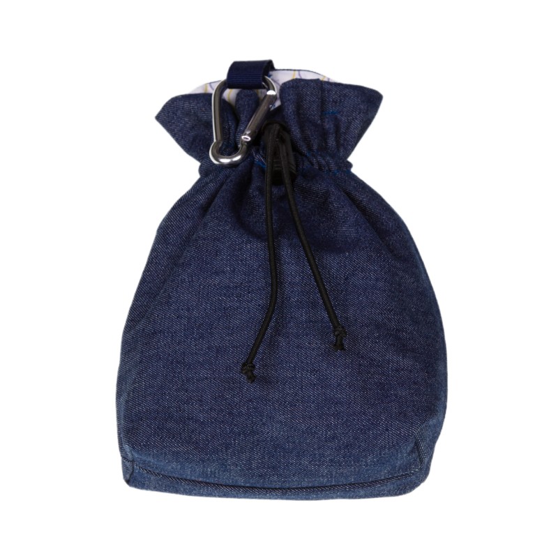 Pratica ed elegante borsa porta-premi in tessuto jeans con moschettone da appendere, ideale per le passeggiate e come idea regalo!