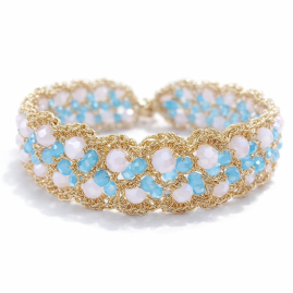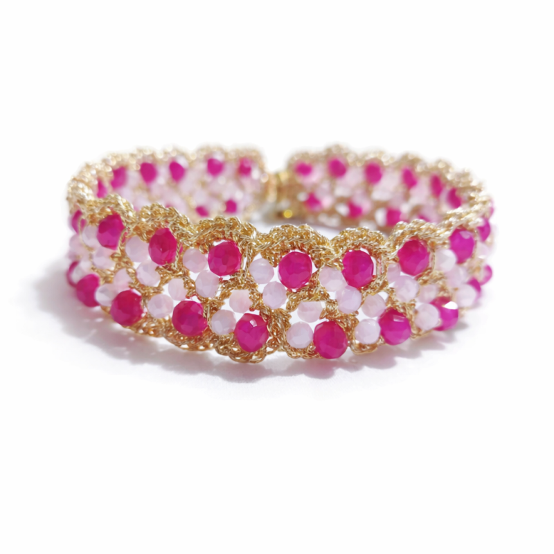 Collanina realizzata interamente a mano con un raffinato intreccio di cristalli sfaccettati rosa pastello e fucsia su una base in filato dorato a crochet. Il punto di forza è l'innovativo sistema Slide-On: