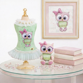 Abitino realizzato in morbido jersey verde menta con al centro una bellissima gufetta studiosa icona di charm. L'abitino racconta storie, accarezza il lusso e gioca con la fantasia- Il collo è impreziosito da una rouche in pizzo chantilly bianco, punteggiata da perle incastonate in montature dorate, come gioielli di corte. Il fondo è decorato con un doppio strato di tulle bianco vaporoso, rifinito da una fila di perle cucite a mano, che dona movimento e luce ad ogni passo