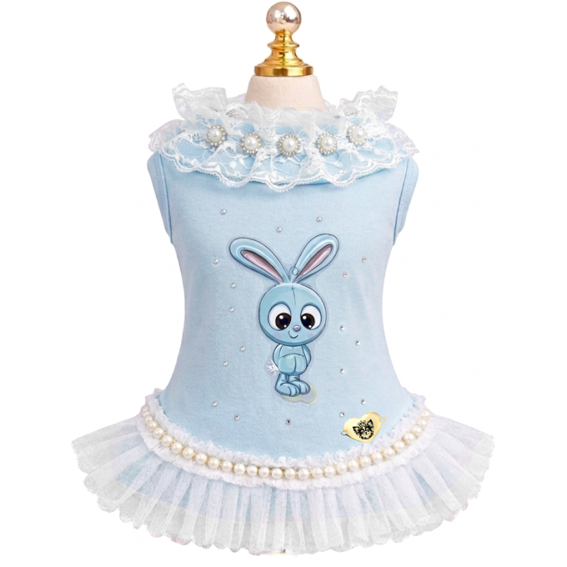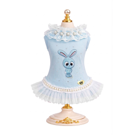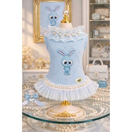 Abitino realizzato in morbido jersey azzurro con al centro un bellissimo e dispettoso coniglietto. L'abitino è un sogno di tulle, perle e tenerezza.
