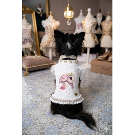 Maglietta con tartarughina decorata tutt'intorno da strass, perle al collo e bordo in pizzo con due fila di strass: un capo dolce e luminoso dal tocco elegante.